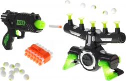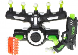 - Schietdoel, pistool voor foamkogels, magazijn, 5 spuitkoppen, 10 polystyreen balletjes, 12 foam pijltjes