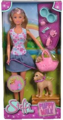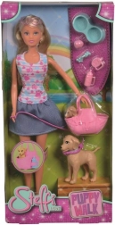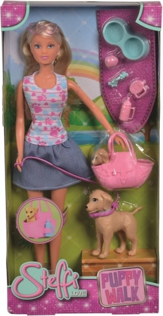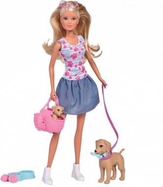 Panenka Steffi Love tijdens een wandeling met twee schattige puppy's. Deze pop bevat stijlvolle kleding en essentiële accessoires voor de verzorging van huisdieren, wat een geweldige gelegenheid biedt voor kinderen om hun verbeeldingskracht en liefde voor huisdieren te ontwikkelen.