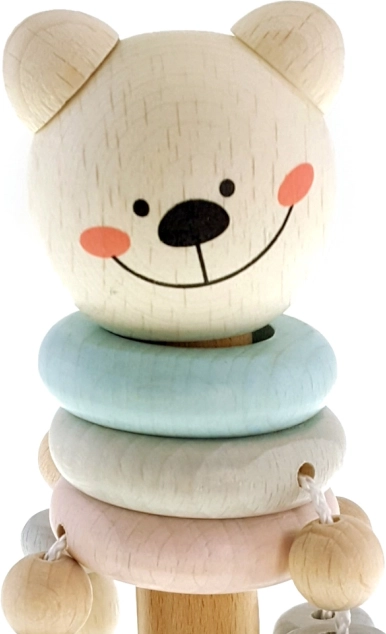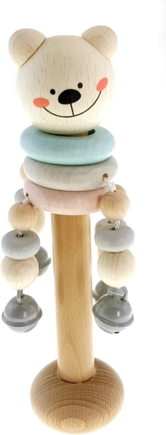 De houten HESS rammelaar in de vorm van een beertje is ontworpen voor de eerste ontdekkingen van geluiden en vormen. Aangename pasteltinten, een gladde afwerking en belletjes moedigen kinderen aan om te grijpen, te schudden en te verkennen, waardoor de fijne motoriek en zintuiglijke waarneming op natuurlijke wijze worden ontwikkeld.