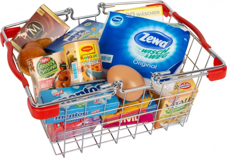 Leuk en duurzaam winkelmandje voor kinderen vanaf 3 jaar, gevuld met mock-ups van alledaagse producten. Stimuleert winkeltje spelen, ontwikkelt fantasie en sociale vaardigheden. Metalen uitvoering met kunststof hoekbeschermers voor extra veiligheid en lange levensduur.