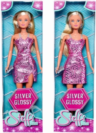 Pop Steffi in effectvolle glinsterende jurk met oorbellen en haarspeld, 2 soorten. Lengte van de pop 29 cm.