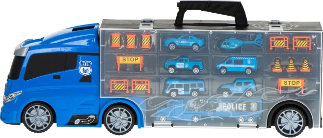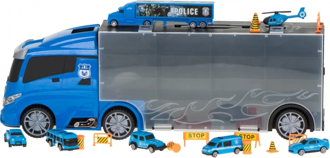 De set bevat 6 gedetailleerde metalen politieauto’s en een helikopter, aangevuld met verkeerselementen voor spannende scènes. De transporter biedt plaats aan tot 26 autootjes, dus er is genoeg ruimte voor extra verzamelstukken.