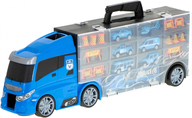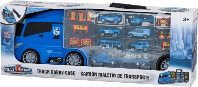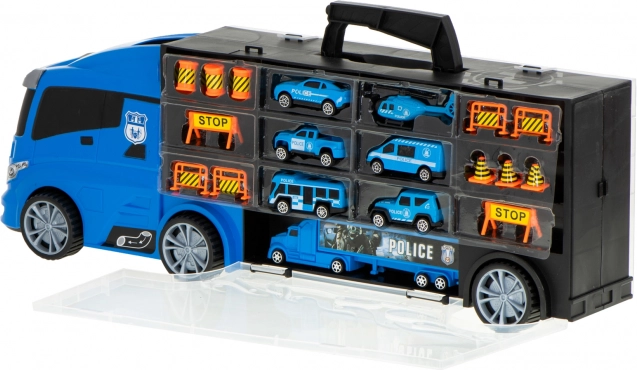 De grote blauwe politietruck werkt als een praktische transporter en autokoffer. Er passen tot wel 26 autootjes in, hij heeft te openen zijdeuren, een voorste autolanceerder voor snelle actie en een handgreep voor gemakkelijk dragen. In de set vind je 6 metalen politievoertuigen en een helikopter voor realistisch speelnodig optreden.