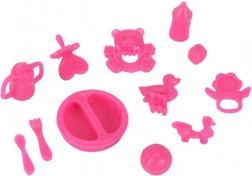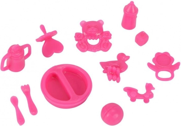De set bevat verschillende roze plastic speeltjes zoals een bord, bestek en flesje, die de speelervaring verrijken.