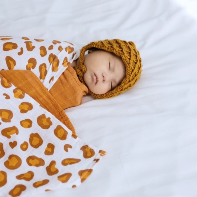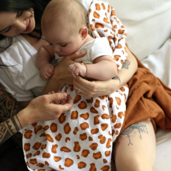 Dankzij het royale formaat van 120 × 120 cm is hij ideaal om in te bakeren, af te dekken en voor dagelijks gebruik thuis en onderweg. Het stijlvolle motief witte luipaard spreekt ouders aan die een praktisch accessoire met een modern design zoeken.
