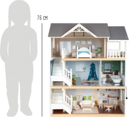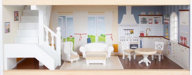 Het poppenhuis heeft een lichte buitenkant, een modern ontwerp en functionele elementen zoals schuifdeuren en open ramen.