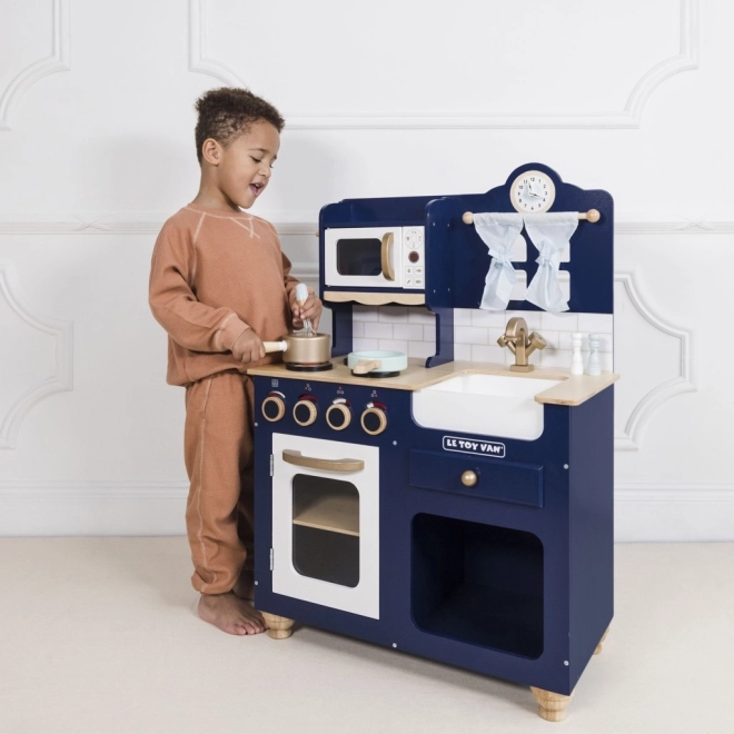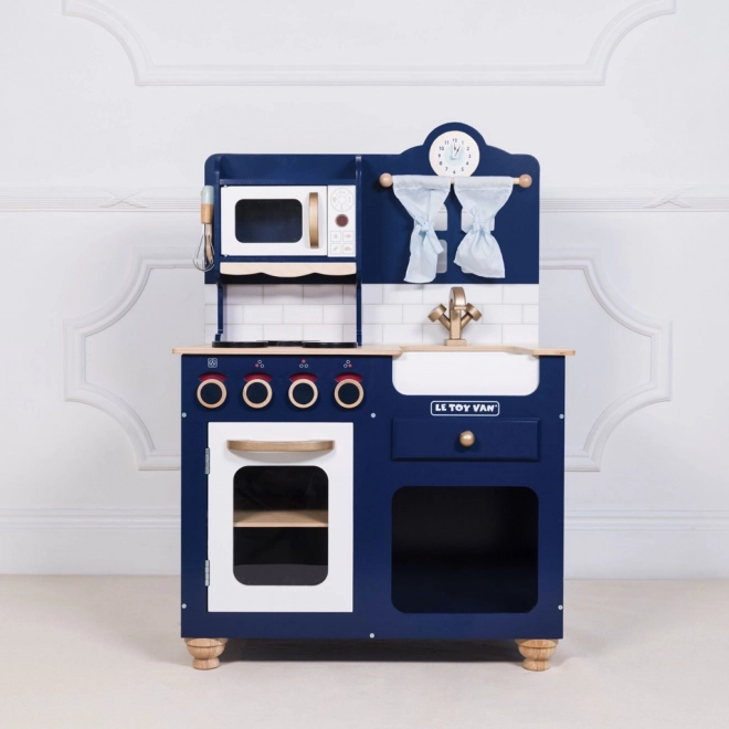 Een stijlvolle kinderkeuken van hoogwaardig hout in koningsblauw met gouden accenten biedt kinderen urenlang creatief en fantasierijk spel. Voorzien van een openende oven, draaiknoppen, gootsteen, magnetron, een schattig raampje met gordijnen en een klok met draaibare wijzers. In de set zitten houten accessoires – garde, houten lepel, zoutvaatje en peperstrooier. Ethisch vervaardigd van duurzaam hout en beschilderd met niet-giftige verf op waterbasis.