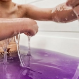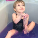 Glibbi verandert het bad in paars glinsterend slijm, wat kinderen een geheel nieuwe beleving van het dagelijkse baden geeft.