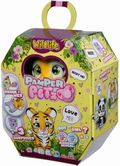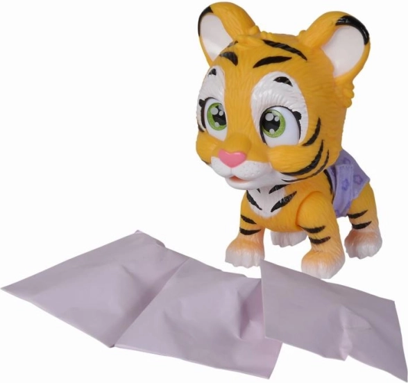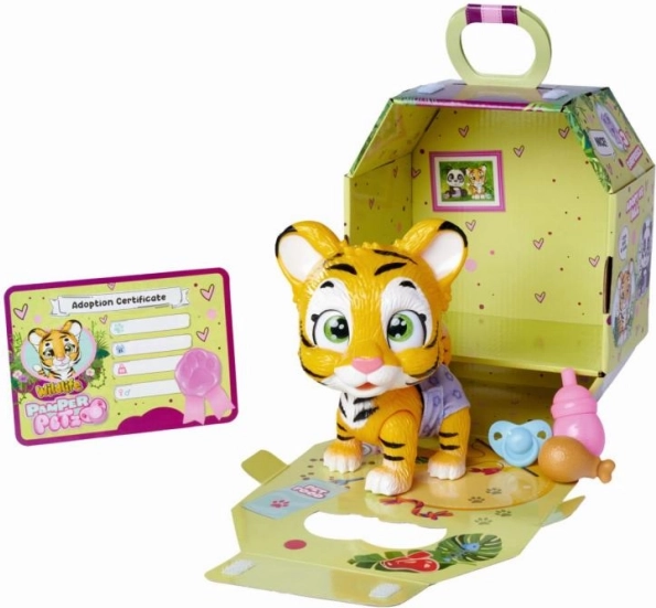 Ontdek de magie met de schattige Pamper Petz tijger! Deze interactieve tijger met luier is ontworpen zodat kinderen de wereld van dierenverzorging kunnen ontdekken en het plezier kunnen beleven van het adopteren van hun nieuwe vriend. De tijger beschikt over functies waarmee hij water uit een flesje kan drinken en in de luier kan plassen, die van kleur verandert op basis van de vochtigheid.