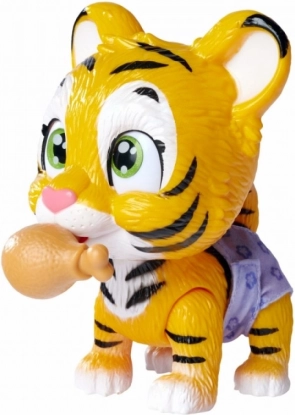 De tijger drinkt water uit de bijgeleverde fles en verandert van kleur in de luier - authentiek spel voor kinderen.