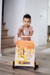 Deze loopwagen heeft een kleurrijk design en biedt verschillende activiteiten aan drie zijden, waaronder een vormenstoof, telraam en schuifdoolhof. De voorwielen zijn uitgerust met “pootjes” die tijdens het rijden een grappig geluid maken, wat extra speelplezier geeft. Een praktische extra is bovendien de opbergmand, die gemakkelijk te onderhouden is.