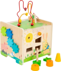 Ontdek de veelzijdige houten motorische kubus met konijnthema, die maar liefst vijf kanten vol plezier biedt. Kinderen genieten van een kralenlabyrint, vormenstoof, draaibare tandwielen en een xylofoon. Praktisch is de mogelijkheid om de kubus om te vormen tot een stoeltje en het bovenste deel met het labyrint veilig op te bergen. Geweldig voor de fijne motoriek, logisch denken en sensorische ontwikkeling van kinderen vanaf 12 maanden.