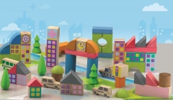 Deze hoogwaardige houten bouwset is een ideale keuze voor de eerste bouwprojecten. Dankzij de diverse vormen en kleurrijke prints bouwen kinderen eenvoudig huisjes, straten en een heel stadje. Er zijn ook eenvoudige houten voertuigen en een speelmat inbegrepen, die het spel een verhaal geven en de fantasie stimuleren.