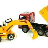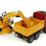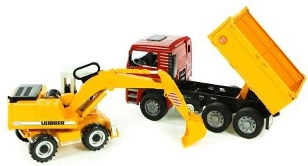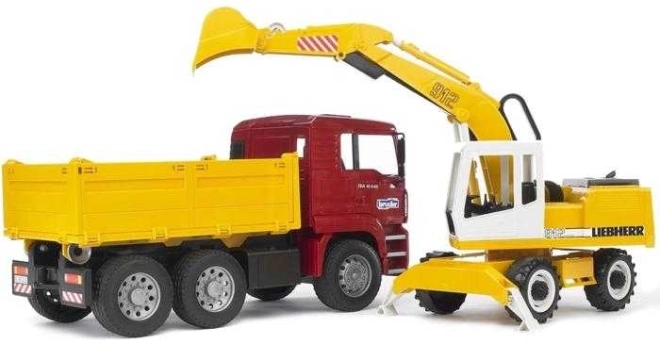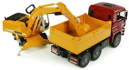 Deze fantastische bouwset van Bruder omvat een MAN TGA-vrachtwagen met zachte banden en een praktische kiepbak. Daarbij hoort een functionele Liebherr-graafmachine met stabilisatiesteunen, geprofileerde banden en een graafarm met een cabine die 360° draait. Het product is in Duitsland kwalitatief afgewerkt met duurzame materialen.