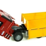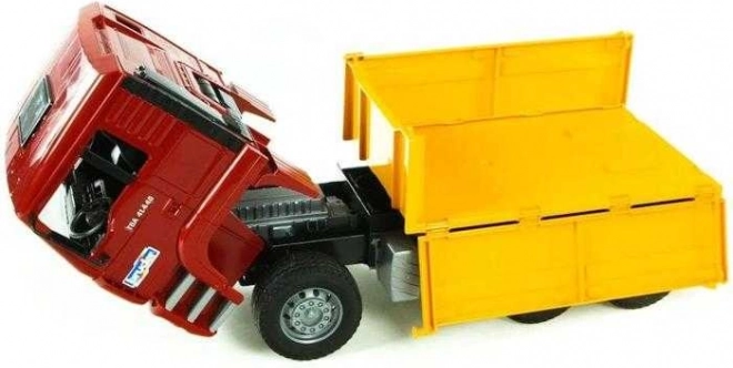 De MAN-vrachtwagen is uitgerust met een kiepbak die gemakkelijk laden en lossen van materiaal mogelijk maakt.