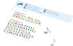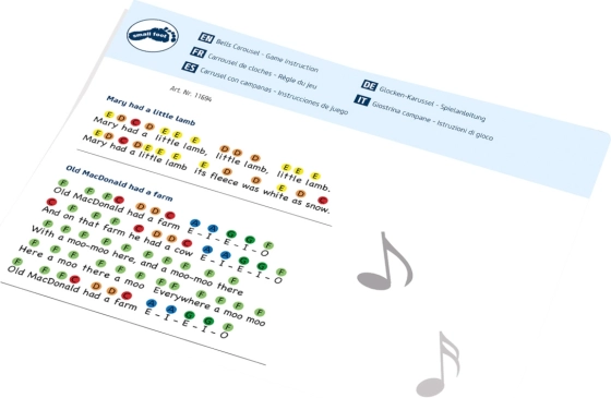 In de verpakking zitten bladmuziekjes met kleurmarkeringen en populaire kinderliedjes voor een snelle start.