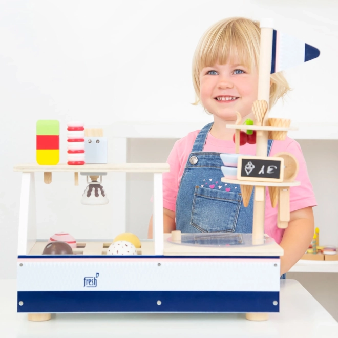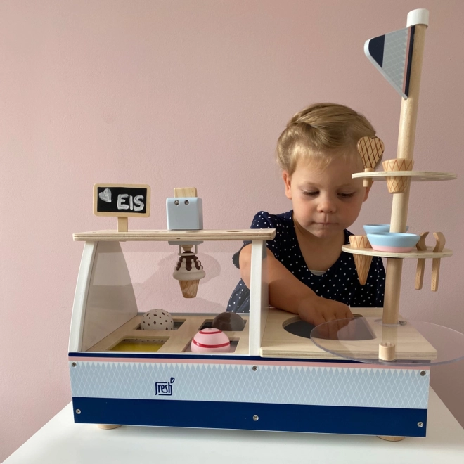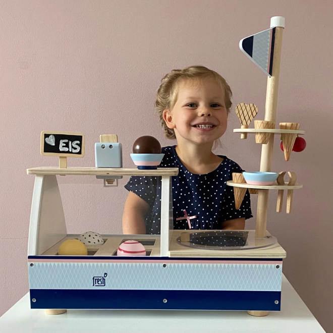 De complete set bevat acht verschillende ijssmaken, waaronder vanille, chocolade, stracciatella en aardbei. Interactieve elementen zoals houders voor hoorntjes, een kunststof vitrine en een vriesvak met transparante klep versterken de spelbeleving.