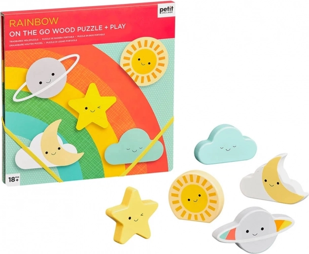 Duurzame houten puzzel voor de allerkleinsten vanaf 18 maanden. 5 houten stukjes, 2 speel scènes en een vrolijk regenboog-motief ondersteunen de fijne motoriek, concentratie en het plezier van ontdekken. Gemaakt van hout en gerecycled papier.