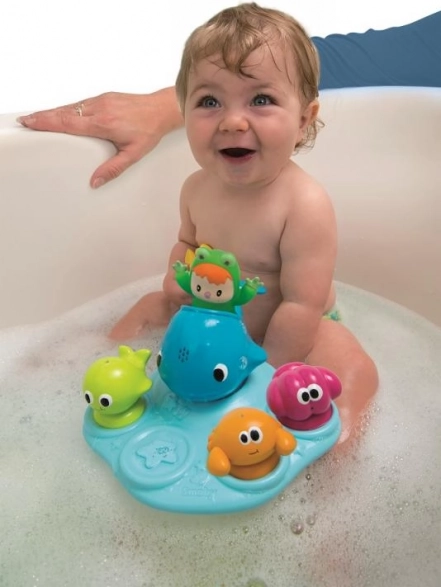 Breng plezier in het dagelijkse badmoment met het drijvende Cotoons-eiland. Dit speelse eiland is ideaal voor in bad; de kleurrijke diertjes verrukken elk kind, met als favoriet de walvis die ook als gietertje fungeert.