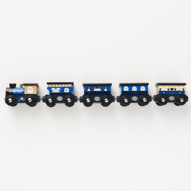De trein is versierd met maan- en sterrenmotieven, aangevuld met gouden details die een aansprekende visuele indruk creëren.