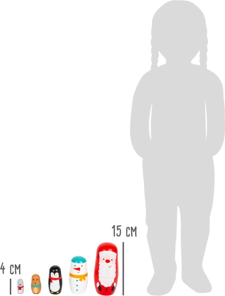 Ontdek de magie van Kerst met de houten matroesjka’s van Small Foot. Vijf zorgvuldig geschilderde figuren in traditionele Russische stijl passen stap voor stap in elkaar – van de grootste tot de kleinste. De set is perfect als feestelijke decoratie en als lief speelgoed dat de vaardigheden van kinderen op een natuurlijke manier stimuleert.