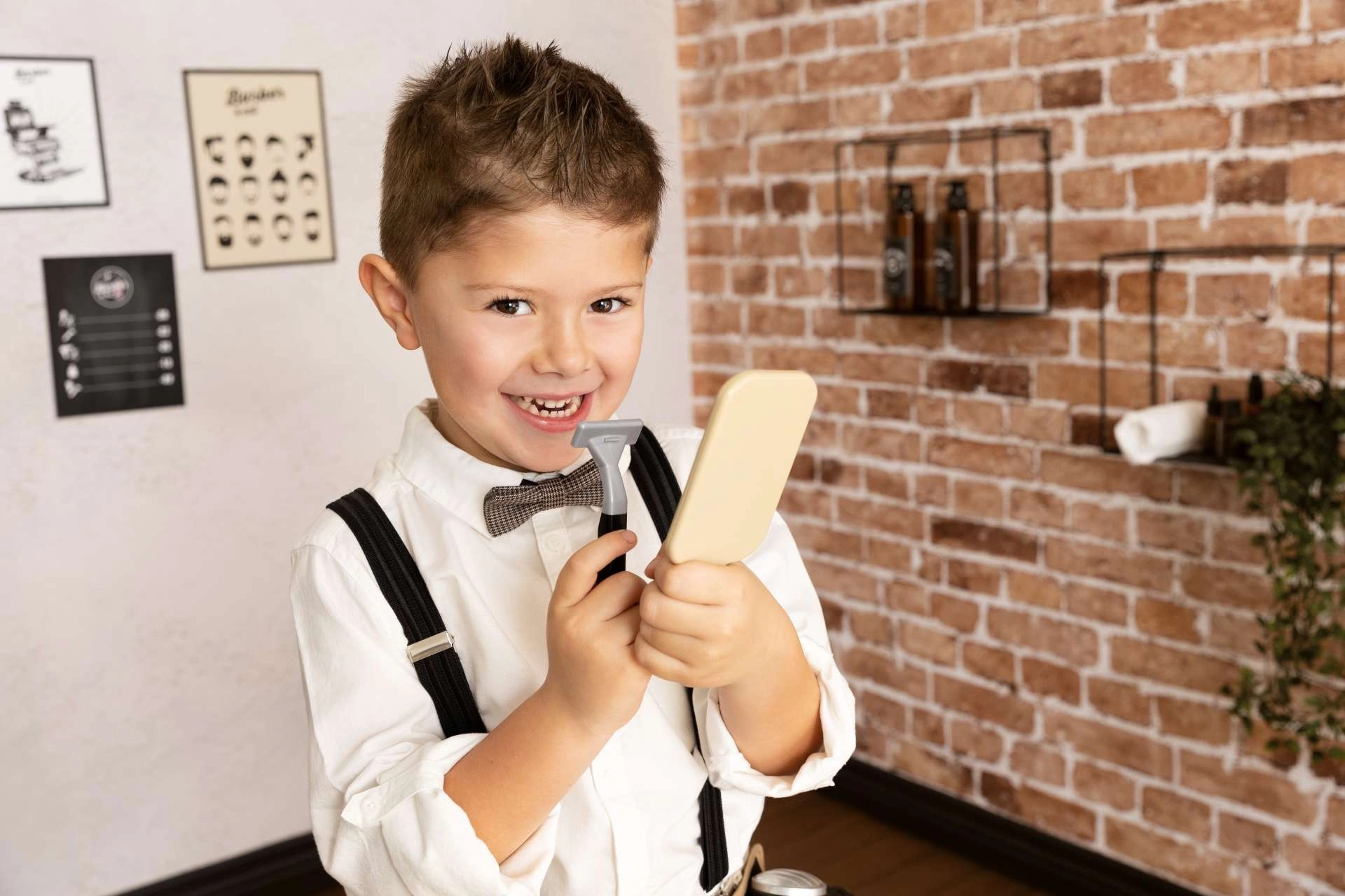Spiegeltje, schaar, kam, borstel, scheerapparaat en meer accessoires bieden urenlange, veilige en creatieve pret voor kinderen vanaf 3 jaar.