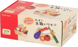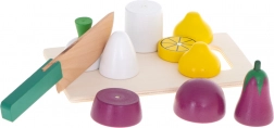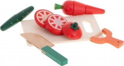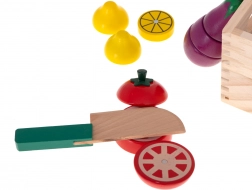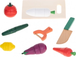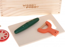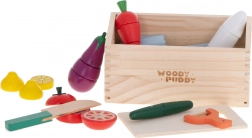 - wortel, peterselie (radijs), komkommer, tomaat (inclusief plakjes), citroen, aubergine, snijplank, kindveilige mes, kindveilige dunschiller, houten kistje