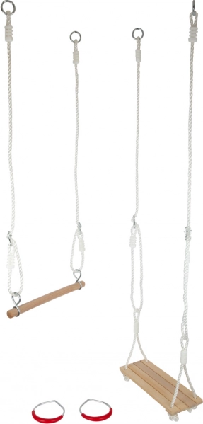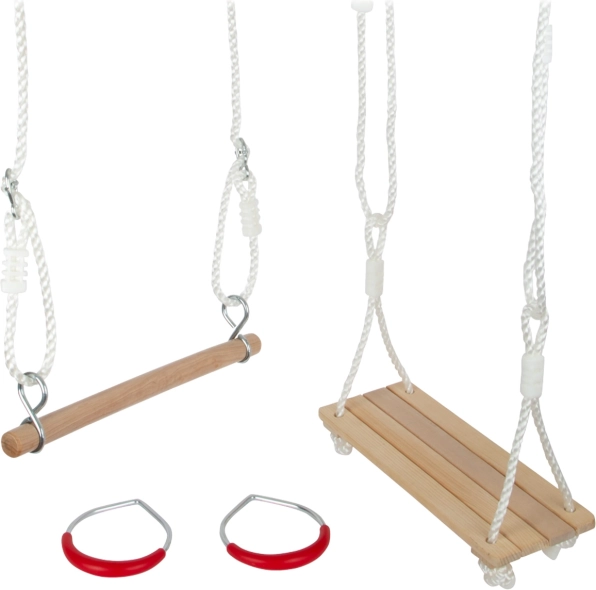 Geniet van driedubbel plezier met de veelzijdige houten 3-in-1 schommel van SMALL FOOT. De set bevat een klassieke schommel, een hangende rekstok en gymringen met kunststof grepen. Dankzij 4 in hoogte verstelbare, weerbestendige touwen pas je de hoogte eenvoudig aan, en met twee sets touwen kun je twee schommels tegelijk gebruiken. Eenvoudig op te hangen, hoogwaardige materialen en een draagvermogen tot 100 kg zorgen voor veilig plezier binnen en buiten.
