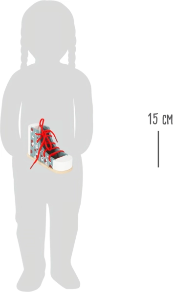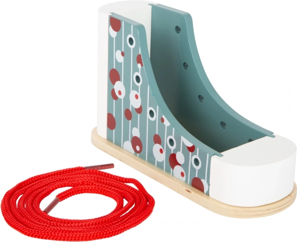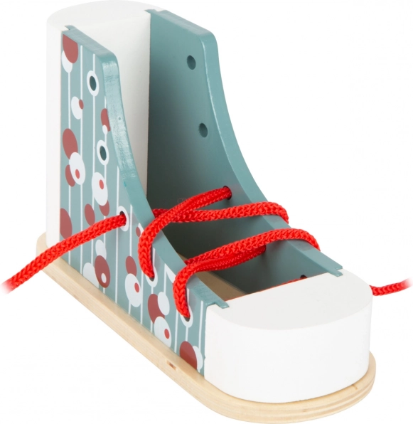 Houten speelgoed met schoenmotief dat kinderen leert hoe ze hun veters correct kunnen strikken, hun motorische vaardigheden oefent en veel plezier biedt.