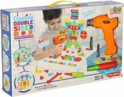 Met het mozaïekbord kunnen kinderen met de speelgoedboormachine, schroevendraaier en sleutel kleurige schroeven vastdraaien en allerlei afbeeldingen en 3D-modellen creëren. Breng de fantasie tot leven – de enige limiet is de verbeelding van de kleine constructeur.