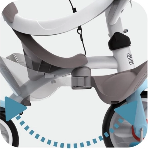 Moderne 3-in-1 driewieler voor kinderen vanaf 10 maanden, die meegroeit met het kind. Biedt een verstelbare duwstang, stuurbekrachtigingsblokkering, parkeerrem, veiligheidsgordels en beschermbeugel, een ergonomische zitting met hoge rugleuning, vrije loop, stille wielen, zonneklep, opklapbare voetsteunen en een praktische opbergbak en tas.