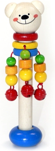 Kleurige houten rammelaar in de vorm van een beer, waarmee spelen nog leuker wordt. Het verfijnde geluid van de belletjes zullen kinderen meteen geweldig vinden. Belangrijkste eigenschappen: ethisch geproduceerd van hout uit duurzaam beheerde bossen, met gebruik van ecologische verven