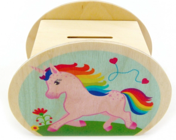 Deze kleurrijke spaarpot met een eenhoorn motiveert kinderen tot financiële geletterdheid en leert de waarde van geld. De robuuste afwerking van natuurlijk hout garandeert een lange levensduur en een aangename natuurlijke uitstraling die prachtig in de kinderkamer past.
