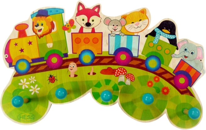 Aantrekkelijke, kleurrijke kapstok voor de kinderkamer of hal met een treintjesmotief en vijf haken om kleding aan op te hangen. Gemaakt van ecovriendelijk hout, afgewerkt met ecologische verven.