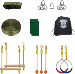De Ninja hindernisbaan 2Kids Toys is gebouwd op een duurzame nylon band, die met behulp van een robuuste metalen ratel tussen twee bomen kan worden gespannen. Aan de band kunnen verschillende soorten hindernissen worden opgehangen, die worden bevestigd met karabijnhaken. Deze variabiliteit maakt het mogelijk om verschillende moeilijkheidsgraden te bereiken en zorgt voor een leuke training voor iedereen. Bovendien kan de baan ook worden gebruikt voor slacklinen.