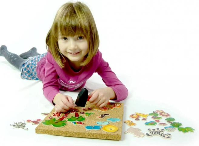 Dit hoogwaardige houten hamer- en spijkerspel biedt kinderen uren zinvol speelplezier. Dankzij de gevarieerde vormen van bedrukte multiplex kunnen jonge makers hun eigen safariscènes creëren en zo creativiteit en logisch denken ontwikkelen. De kurken ondergrond zorgt voor veilig en comfortabel hameren en de grote, halfbolle spijkerkoppen maken de hantering gemakkelijk.
