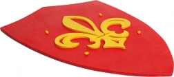 De opvallende rode kleur en gele lelie geven het schild een middeleeuwse charme. Past perfect bij kostuums en ook als decoratie in de kinderkamer.