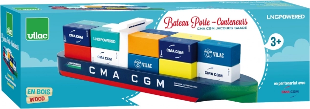 Dit stijlvolle houten schip brengt de wereld van grote havens naar de kinderkamer. Dankzij de 18 magnetische containers laden en lossen kinderen gemakkelijk de vracht en ontwikkelen ze hun verbeelding en coördinatie. Het model is geïnspireerd op een echt schip dat wordt aangedreven door LNG en is ontstaan in samenwerking met CMA CGM.