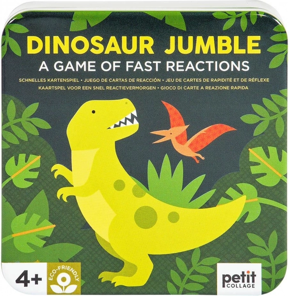 Train je reactievermogen met dinosaurussen. Dit kaartspel biedt tot vijf spelvarianten en zit vol kleurrijke illustraties met dinosaurus-thema. Je zult het zeker ook snel waarderen vanwege het compacte formaat, geschikt om thuis en onderweg te spelen. Verpakt in een metalen blikje zonder gebruik van plastic. Belangrijkste kenmerken voor 2–6 spelers 5 varianten van spelregels praktische verpakking Spelregels: Basisvariant: Deel aan elke speler één kaart met de afbeelding naar beneden. Plaats de stapel met de afbeelding naar boven tussen de spelers. Op een afgesproken signaal draaien de spelers hun kaarten om. De speler die als eerste het identieke symbool op zijn kaart en op de kaart van de stapel noemt, neemt de kaart van de stapel. Zo wordt de stapel uiteindelijk opgemaakt en de winnaar is de speler met de meeste kaarten. Omgekeerde variant: Verdeel de kaarten onder de spelers zodat iedereen hetzelfde aantal kaarten heeft en er één kaart overblijft. De spelers leggen hun kaartenstapel voor zich met de afbeelding naar beneden. Leg de overgebleven kaart met de afbeelding naar boven tussen de spelers. Op een afgesproken signaal draaien de spelers de bovenste kaart van hun stapel om. Wie als eerste het symbool noemt dat overeenkomt met zijn kaart en de kaart tussen de spelers, legt zijn kaart op de groeiende stapel in het midden en draait vervolgens zijn volgende bovenste kaart om. Het spel gaat zo door totdat er één speler met kaarten overblijft; die is de verliezer. De speler die als eerste al zijn kaarten heeft weggespeeld, is de winnaar. Groepsvariant: Er wordt in rondes gespeeld. In elke ronde krijgt elke speler één kaart met de afbeelding naar beneden. Op een afgesproken signaal draaien de spelers hun kaart om; wie als eerste een symbool noemt dat overeenkomt met het symbool op de kaart van een andere speler, geeft zijn kaart aan die speler. Het spel gaat door totdat één speler alle in die ronde uitgedeelde kaarten ontvangt. Het doel is om van je kaarten af te komen; de speler die in totaal over de rondes de meeste kaarten ontvangt, is de verliezer.