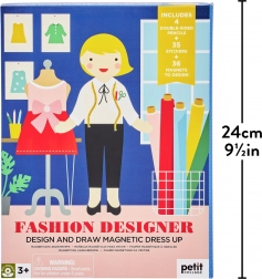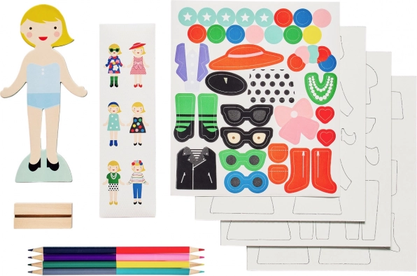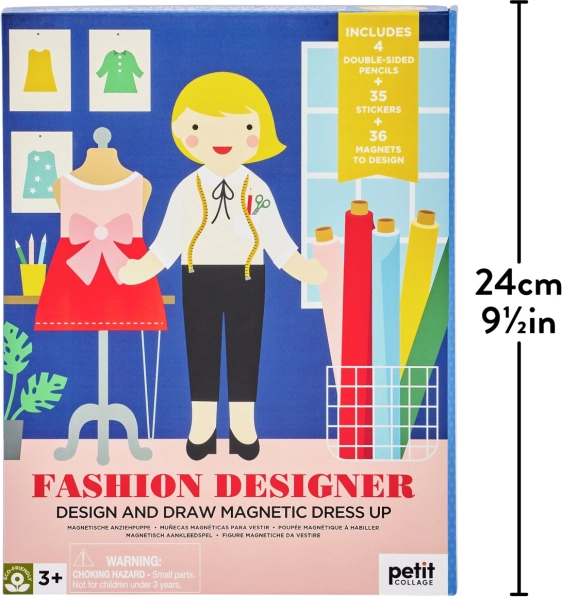 Het speelgoed bevat een magnetisch figuurtje met een houten standaard, 36 magnetische kledingstukken, 4 dubbelzijdige kleurpotloden en 35 stickers, wat meer dan 100 verschillende outfits mogelijk maakt. Kinderen kunnen hun creativiteit uiten en hun verbeelding ontwikkelen dankzij de diversiteit van de stukken en de combinatiemogelijkheden. De doos dient niet alleen als opslagruimte, maar ook als een aangename achtergrond voor het spel, waardoor de hele ervaring compleet en esthetisch is.