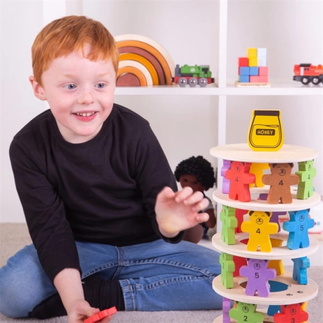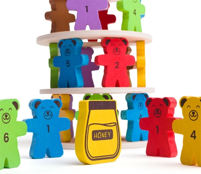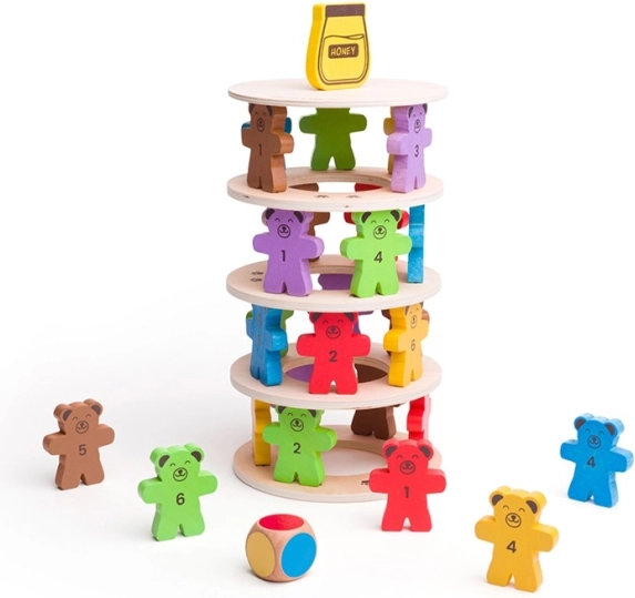 Ontdek de magie van de Vallende Beren, een leuk en tegelijk educatief houten spel voor kinderen. Dit spel helpt bij het ontwikkelen van fijne motoriek, strategisch denken en het herkennen van kleuren en cijfers. Jouw doel is om de berentoren zo hoog mogelijk te bouwen zonder dat deze omvalt.