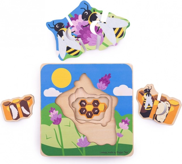 Ontdek hoe een bij uit een eitje ontstaat! Deze leerzame en leuke lagenpuzzel met bijen heeft 4 lagen, 7 stukjes en is ideaal voor kinderen vanaf 2 jaar. Gemaakt van hoogwaardig hout uit verantwoorde bronnen, voldoet aan de Europese veiligheidsnormen en biedt een robuuste, duurzame uitvoering.