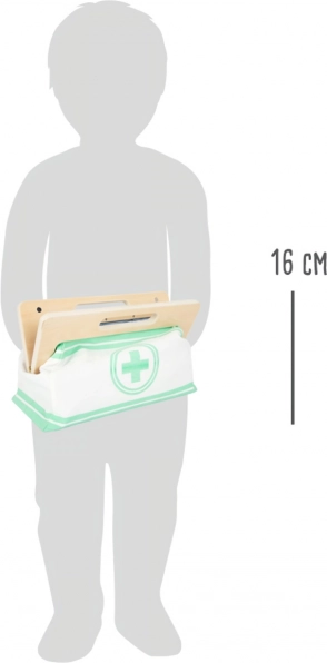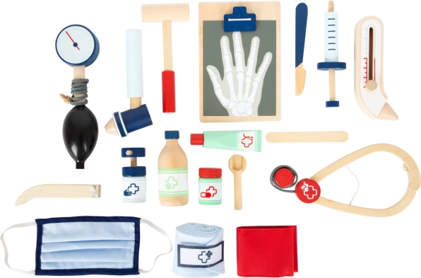 De set bevat uitgebreide accessoires: stethoscoop, thermometer met instelbare temperatuur, injectiespuit met bewegend mechanisme, otoscoop met echte loep, maar ook een bloeddrukmeter met manchet en ballon, desinfectie met pompje, flesjes, lepeltje, pincet, scalpel, reflexhamertje en textielen mondkapjes. Kinderen kunnen een “patiënt” verzorgen, leren de basis van zorg en verminderen angst voor een doktersbezoek.