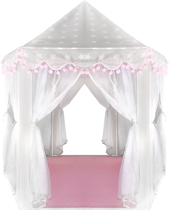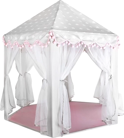 De ruime onderlegger en luchtige zijwanden zorgen voor comfort voor één of meerdere kinderen – er is plek voor veel kussens, knuffels en boekjes. De tent is ideaal voor binnen en in de tuin onder toezicht van volwassenen. Decoratieve pompons en de mogelijkheid om de gordijntjes vast te strikken geven het spel flair én privacy.