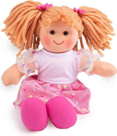 Maak kennis met de stoffen pop Darcie, een speelse metgezel voor de allerkleinsten. De pop heeft lichte vlechten, een wit jurkje met een roze rok met stippen en bijpassende roze schoentjes. Ze is zacht, knuffelbaar en voldoet aan de Europese veiligheidsnormen.