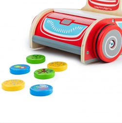 Een verborgen magneet aan de onderzijde van de stofzuiger vangt gekleurde houten schijfjes, waardoor kinderen directe feedback krijgen en het spel echt werkt.