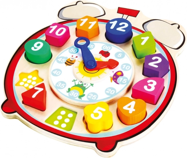 Dit multifunctionele houten leerspeelgoed combineert een inlegpuzzel met een klok. Kleurrijke stukjes van verschillende vormen met cijfers worden in de overeenkomstige openingen geplaatst, en onder de stukjes staan puntjes voor eenvoudige oriëntatie en eerste rekenoefeningen. Draaibare uur- en minuutwijzers helpen kinderen het principe van tijdmeting op een leuke en aanschouwelijke manier te begrijpen.