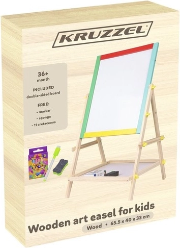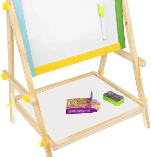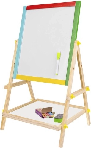 Dubbelzijdig houten bord voor kinderen met een zwarte en een witte (droog uitwisbare) zijde ondersteunt creativiteit, leren en fijne motoriek. Het gekleurde frame is van glad afgewerkt hout; de stabiele constructie wordt aangevuld met een praktische plank voor accessoires. In de set vind je een marker, spons en krijtjes – klaar voor direct gebruik.