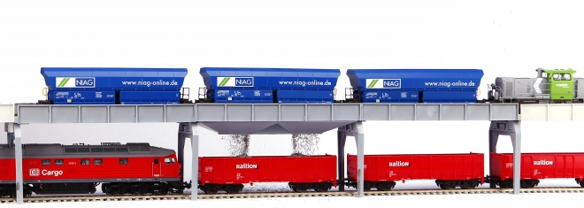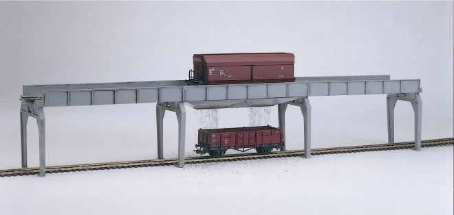Realistisch model van een betonnen raambrug met geïntegreerde lossfunctie voor bulklading in schaal H0. Bestaat uit drie segmenten met een bedding voor de rails en geleiders voor het automatisch openen van de kleppen van de wagons. Ideale aanvulling voor een gedetailleerde modelbaan en een soepel bedrijf van goederentreinen. Functioneel lossen, automatische klepbediening en stevige raamconstructie voor authentieke inzet.