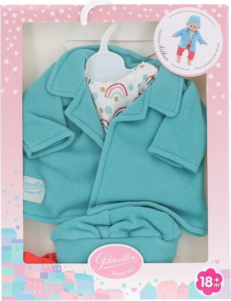 De Petitcollin Arthur outfit verandert elke pop van 36 cm in een elegante speelmaatje. De set combineert een turquoise fleece trui, een vrolijk gedessineerde blouse, een rode korte broek en een bijpassend mutsje – samen creëren ze een aantrekkelijke en comfortabele outfit voor alledaagse avonturen.
